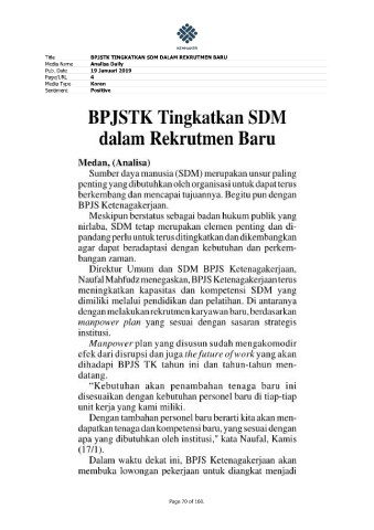 Title BPJSTK TINGKATKAN SDM DALAM REKRUTMEN BARU Media Name Analisa Daily Pub. Date 19 Januari 2019 Page/URL 4 Media Type Koran Sentiment Positive Page 70 of 160.