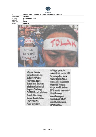 Title BERITA FOTO - AKSI TOLAK REVISI UU KETENAGAKERJAAN Media Name Indopos Pub. Date 05 September 2019 Page/URL 2 Media Type Koran Sentiment Negative Page 12 of 136.