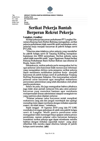 Title SERIKAT PEKERJA BANTAH BERPERAN REKRUT PEKERJA Media Name Analisa Daily Pub. Date 04 September 2019 Page/URL 16 Media Type Koran Sentiment Positive Page 39 of 136.