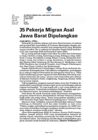 Title 35 PEKERJA MIGRAN ASAL JAWA BARAT DIPULANGKAN Media Name Pikiran Rakyat Pub. Date 22 April 2019 Page/URL 8 Media Type Koran Sentiment Positive Page 6 of 89.