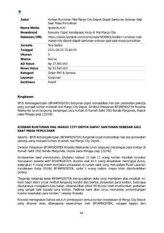yang menjadi korban musibah mal Margo City Depok. Direktur Pelayanan BPJAMSOSTEK Roswita