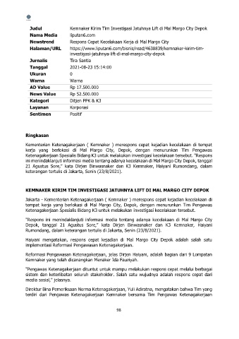Judul Kemnaker Kirim Tim Investigasi Jatuhnya Lift di Mal Margo City Depok