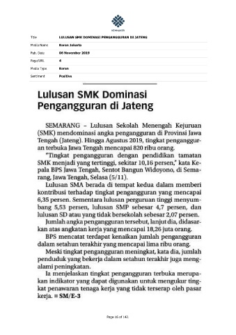 Title LULUSAN SMK DOMINASI PENGANGGURAN DI JATENG Media Name Koran Jakarta Pub. Date 06 November 2019 Page/URL 4 Media Type Koran Sentiment Positive Page 16 of 142.