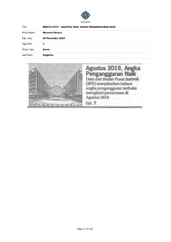 Title BERITA FOTO - AGUSTUS 2019, ANGKA PENGANGGURAN NAIK Media Name Ekonomi Neraca Pub. Date 06 November 2019 Page/URL 3 Media Type Koran Sentiment Negative Page 17 of 142.