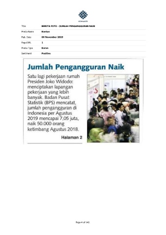 Title BERITA FOTO - JUMLAH PENGANGGURAN NAIK Media Name Kontan Pub. Date 06 November 2019 Page/URL 1 Media Type Koran Sentiment Positive Page 4 of 142.