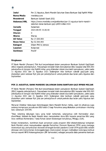 Judul Per 21 Agustus, Bank Mandiri Salurkan Dana Bantuan Gaji Rp800 Miliar
