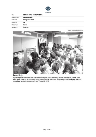 Title BERITA FOTO - BURSA KERJA Media Name Investor Daily Pub. Date 15 Agustus 2019 Page/URL 21 Media Type Koran Sentiment Positive Page 15 of 117.