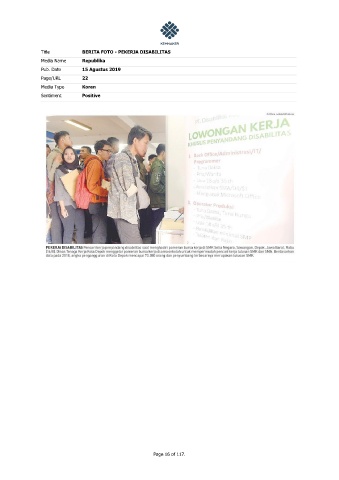 Title BERITA FOTO - PEKERJA DISABILITAS Media Name Republika Pub. Date 15 Agustus 2019 Page/URL 22 Media Type Koran Sentiment Positive Page 16 of 117.