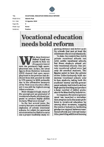 Title VOCATIONAL EDUCATION NEEDS BOLD REFORM Media Name Jakarta Post Pub. Date 15 Agustus 2019 Page/URL 5 Media Type Koran Sentiment Positive Page 17 of 117.