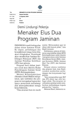 Title MENAKER ELUS DUA PROGRAM JAMINAN Media Name Rakyat Merdeka Pub. Date 15 Agustus 2019 Page/URL 13 Media Type Koran Sentiment Positive Page 5 of 117.