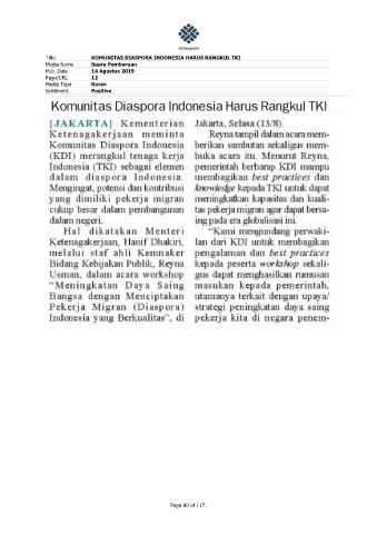 Title KOMUNITAS DIASPORA INDONESIA HARUS RANGKUL TKI Media Name Suara Pembaruan Pub. Date 14 Agustus 2019 Page/URL 12 Media Type Koran Sentiment Positive Page 80 of 117.