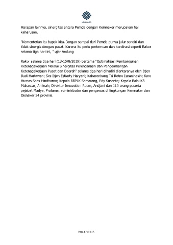 Harapan lainnya, sinergitas antara Pemda dengan Kemnaker merupakan hal