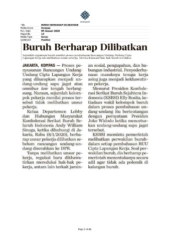 Title BURUH BERHARAP DILIBATKAN Media Name Kompas Pub. Date 09 Januari 2020 Page/URL 14 Media Type Koran Sentiment Positive Page 2 of 68.