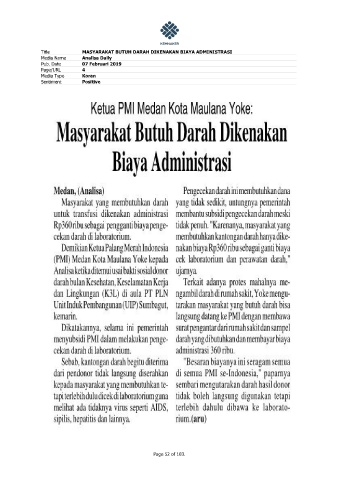 Title MASYARAKAT BUTUH DARAH DIKENAKAN BIAYA ADMINISTRASI Media Name Analisa Daily Pub. Date 07 Februari 2019 Page/URL 4 Media Type Koran Sentiment Positive Page 52 of 103.