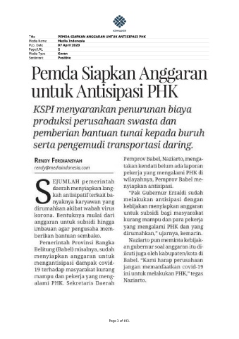 Title PEMDA SIAPKAN ANGGARAN UNTUK ANTISIPASI PHK Media Name Media Indonesia Pub. Date 07 April 2020 Page/URL 2 Media Type Koran Sentiment Positive Page 3 of 193.
