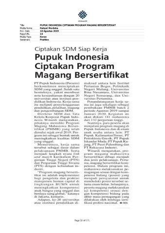 Title PUPUK INDONESIA CIPTAKAN PROGRAM MAGANG BERSERTIFIKAT Media Name Rakyat Merdeka Pub. Date 18 Agustus 2019 Page/URL 14 Media Type Koran Sentiment Positive Page 32 of 171.