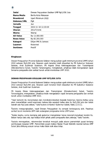 2022 sebesar Rp3,056 juta. Besaran upah tersebut telah diusulkan ke Plt Gubernur Sulawesi