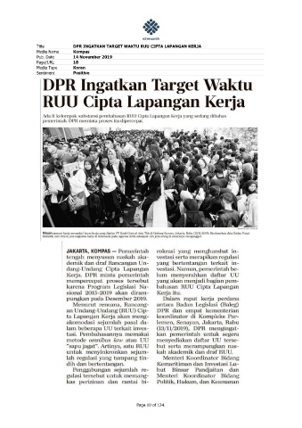 Title DPR INGATKAN TARGET WAKTU RUU CIPTA LAPANGAN KERJA Media Name Kompas Pub. Date 14 November 2019 Page/URL 18 Media Type Koran Sentiment Positive Page 10 of 124.