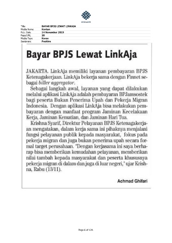 Title BAYAR BPJS LEWAT LINKAJA Media Name Kontan Pub. Date 14 November 2019 Page/URL 20 Media Type Koran Sentiment Positive Page 6 of 124.