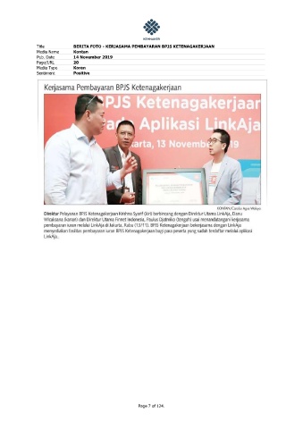 Title BERITA FOTO - KERJASAMA PEMBAYARAN BPJS KETENAGAKERJAAN Media Name Kontan Pub. Date 14 November 2019 Page/URL 20 Media Type Koran Sentiment Positive Page 7 of 124.
