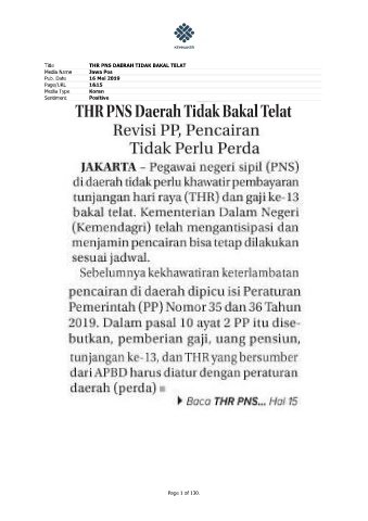 Title THR PNS DAERAH TIDAK BAKAL TELAT Media Name Jawa Pos Pub. Date 16 Mei 2019 Page/URL 1&15 Media Type Koran Sentiment Positive Page 1 of 130.
