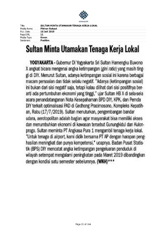 Title SULTAN MINTA UTAMAKAN TENAGA KERJA LOKAL Media Name Pikiran Rakyat Pub. Date 18 Juli 2019 Page/URL 11 Media Type Koran Sentiment Positive Page 22 of 104.