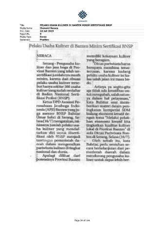 Title PELAKU USAHA KULINER DI BANTEN MINIM SERTIFIKASI BNSP Media Name Ekonomi Neraca Pub. Date 18 Juli 2019 Page/URL 9 Media Type Koran Sentiment Positive Page 34 of 104.
