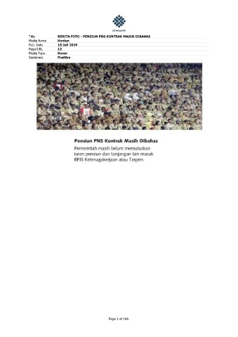 Title BERITA FOTO - PENSIUN PNS KONTRAK MASIH DIBAHAS Media Name Kontan Pub. Date 18 Juli 2019 Page/URL 13 Media Type Koran Sentiment Positive Page 3 of 104.
