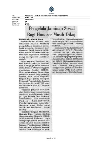 Title PENGELOLA JAMINAN SOSIAL BAGI HONORER MASIH DIKAJI Media Name Warta Kota Pub. Date 18 Juli 2019 Page/URL 14 Media Type Koran Sentiment Positive Page 41 of 104.