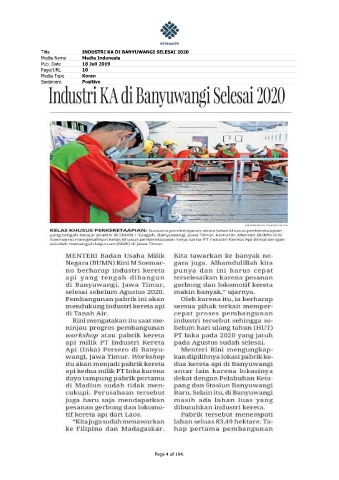 Title INDUSTRI KA DI BANYUWANGI SELESAI 2020 Media Name Media Indonesia Pub. Date 18 Juli 2019 Page/URL 10 Media Type Koran Sentiment Positive Page 4 of 104.