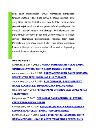 kontan.co.id, Apr 7, 2020: BALEG DPR: PEMBAHASAN RUU CIPTA
