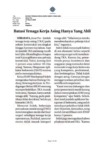 Title BATASI TENAGA KERJA ASING HANYA YANG AHLI Media Name Jawa Pos Pub. Date 19 Maret 2020 Page/URL 3 Media Type Koran Sentiment Negative Page 2 of 142.