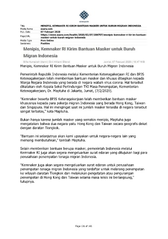 Title MENIPIS, KEMNAKER RI KIRIM BANTUAN MASKER UNTUK BURUH MIGRAN INDONESIA