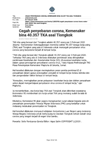 Title CEGAH PENYEBARAN CORONA, KEMENAKER BINA 40.357 TKA ASAL TIONGKOK