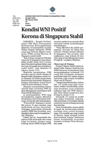 Title KONDISI WNI POSITIF KORONA DI SINGAPURA STABIL Media Name Investor Daily Pub. Date 08 Februari 2020 Page/URL 10 Media Type Koran Sentiment Positive Page 47 of 143.