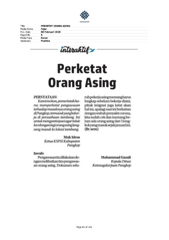 Title PERKETAT ORANG ASING Media Name Fajar Pub. Date 08 Februari 2020 Page/URL 6 Media Type Koran Sentiment Positive Page 63 of 143.