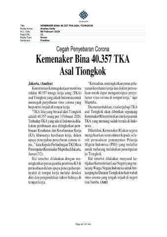 Title KEMENKER BINA 40.357 TKA ASAL TIONGKOK Media Name Analisa Daily Pub. Date 08 Februari 2020 Page/URL 11 Media Type Koran Sentiment Positive Page 82 of 143.
