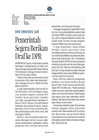 Title PEMERINTAH SEGERA BERIKAN DRAF KE DPR Media Name Media Indonesia Pub. Date 07 Februari 2020 Page/URL 1 Media Type Koran Sentiment Positive Page 84 of 143.