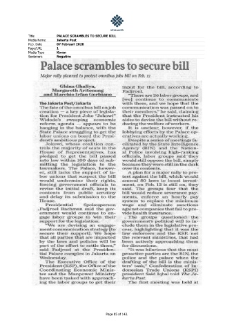 Title PALACE SCRAMBLES TO SECURE BILL Media Name Jakarta Post Pub. Date 07 Februari 2020 Page/URL 1 Media Type Koran Sentiment Negative Page 85 of 143.