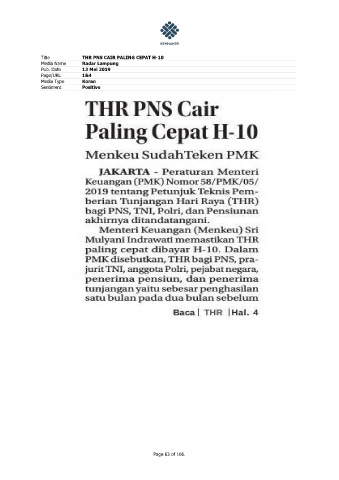 Title THR PNS CAIR PALING CEPAT H-10 Media Name Radar Lampung Pub. Date 13 Mei 2019 Page/URL 1&4 Media Type Koran Sentiment Positive Page 63 of 106.