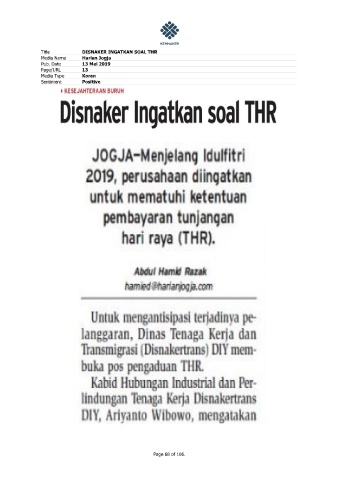 Title DISNAKER INGATKAN SOAL THR Media Name Harian Jogja Pub. Date 13 Mei 2019 Page/URL 13 Media Type Koran Sentiment Positive Page 68 of 106.