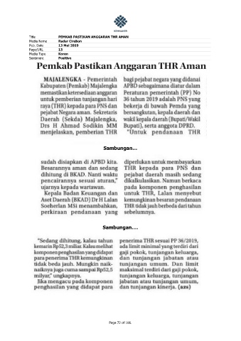 Title PEMKAB PASTIKAN ANGGARAN THR AMAN Media Name Radar Cirebon Pub. Date 13 Mei 2019 Page/URL 13 Media Type Koran Sentiment Positive Sambungan… Sambungan…. Page 72 of 106.