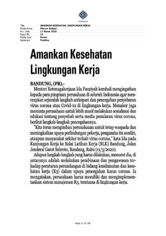 Title AMANKAN KESEHATAN LINGKUNGAN KERJA Media Name Pikiran Rakyat Pub. Date 12 Maret 2020 Page/URL 11 Media Type Koran Sentiment Positive Page 21 of 158.