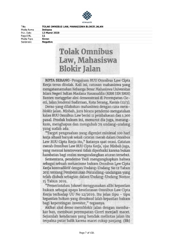 Title TOLAK OMNIBUS LAW, MAHASISWA BLOKIR JALAN Media Name Indopos Pub. Date 13 Maret 2020 Page/URL 11 Media Type Koran Sentiment Negative Page 7 of 158.