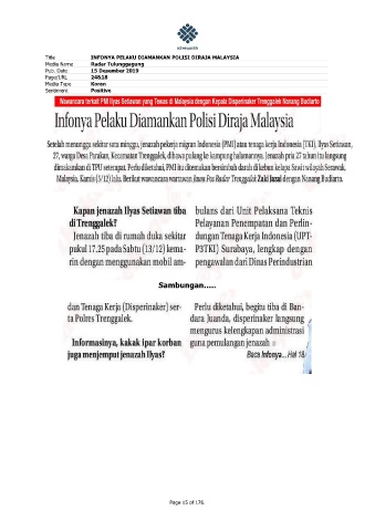 Title INFONYA PELAKU DIAMANKAN POLISI DIRAJA MALAYSIA Media Name Radar Tulunggagung Pub. Date 15 Desember 2019 Page/URL 24&18 Media Type Koran Sentiment Positive Sambungan….. Page 15 of 176.
