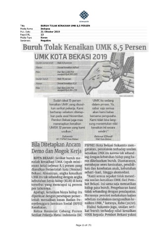 Title BURUH TOLAK KENAIKAN UMK 8,5 PERSEN Media Name Indopos Pub. Date 31 Oktober 2019 Page/URL 13 Media Type Koran Sentiment Negative Page 13 of 172.