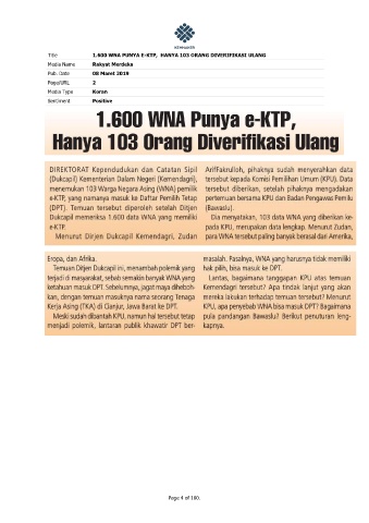 Title 1.600 WNA PUNYA E-KTP, HANYA 103 ORANG DIVERIFIKASI ULANG Media Name Rakyat Merdeka Pub. Date 08 Maret 2019 Page/URL 2 Media Type Koran Sentiment Positive Page 4 of 100.
