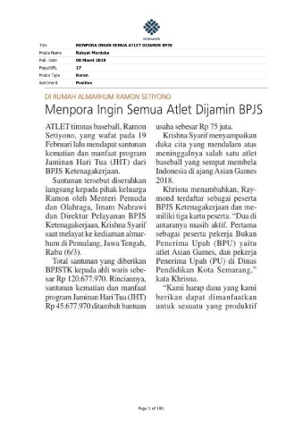 Title MENPORA INGIN SEMUA ATLET DIJAMIN BPJS Media Name Rakyat Merdeka Pub. Date 08 Maret 2019 Page/URL 17 Media Type Koran Sentiment Positive Page 5 of 100.