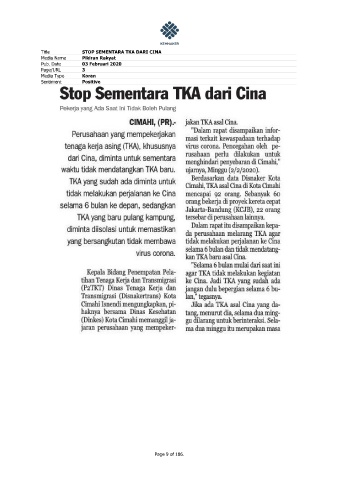 Title STOP SEMENTARA TKA DARI CINA Media Name Pikiran Rakyat Pub. Date 03 Februari 2020 Page/URL 3 Media Type Koran Sentiment Positive Page 9 of 186.