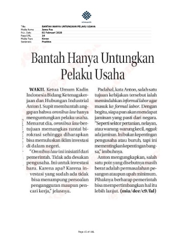 Title BANTAH HANYA UNTUNGKAN PELAKU USAHA Media Name Jawa Pos Pub. Date 02 Februari 2020 Page/URL 16 Media Type Koran Sentiment Positive Page 15 of 186.